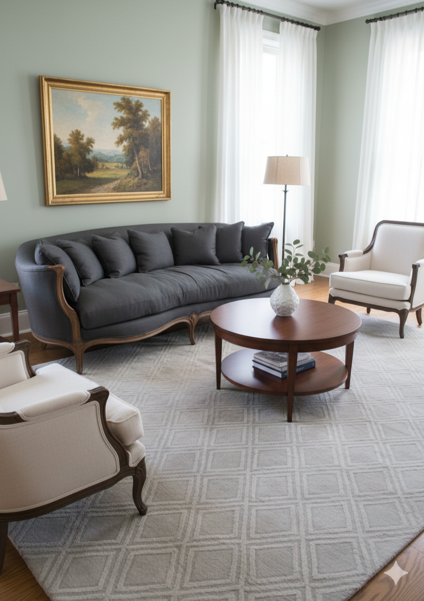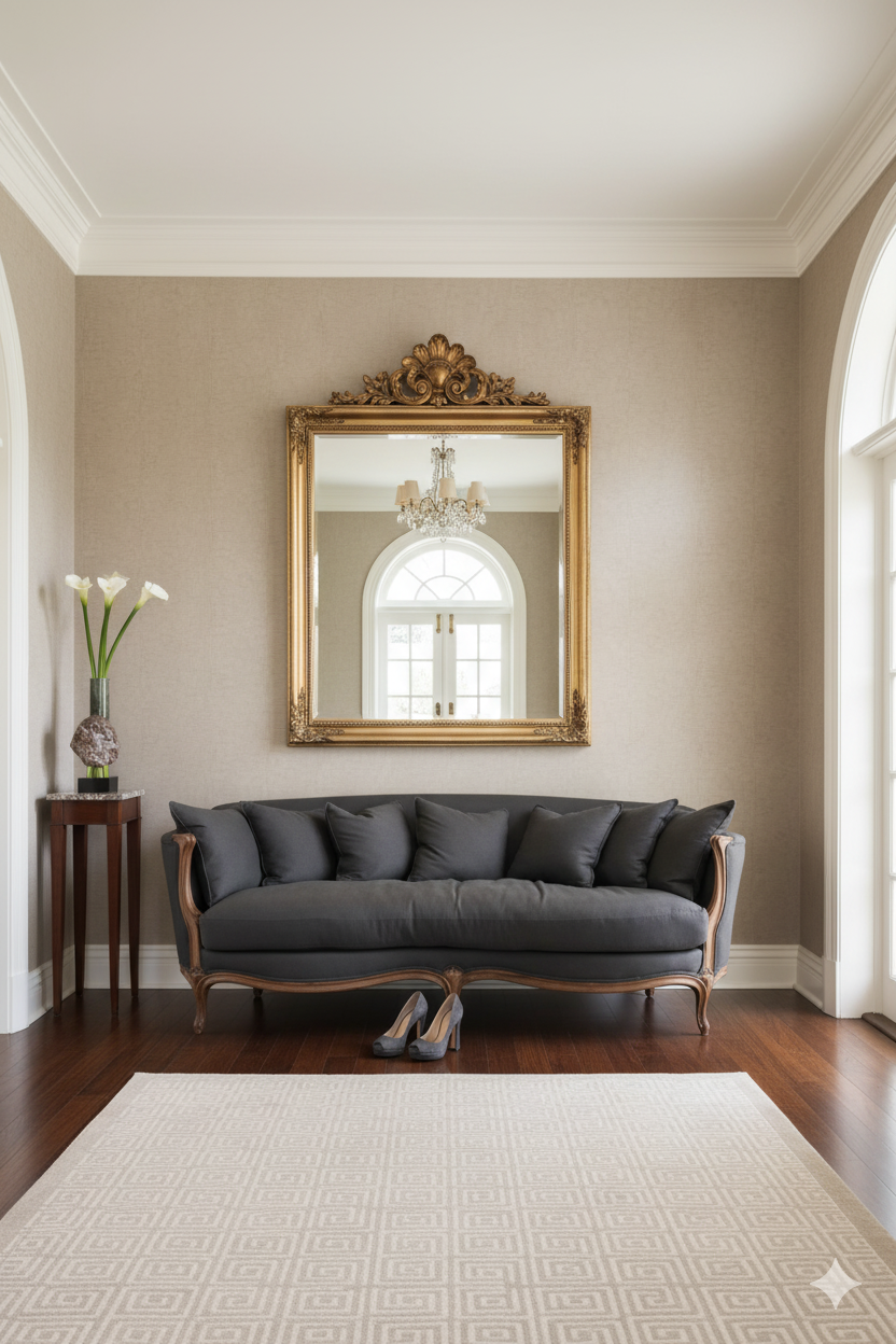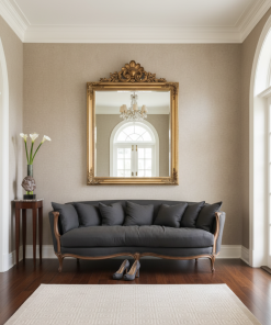 Σχεδιασμός: Καμπυλωτές γραμμές και λεπτομερές σκάλισμα στο ξύλινο πλαίσιο, χαρακτηριστικό της γαλλικής αισθητικής.